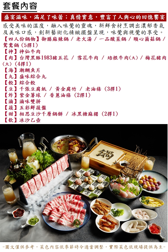 一、本商品禮券為四人套餐,面額價值新台幣貳仟陸佰捌拾圓整,含10%服務費,持有人得於這一鍋所有門店消費時提示使用,但不得兌換現金。