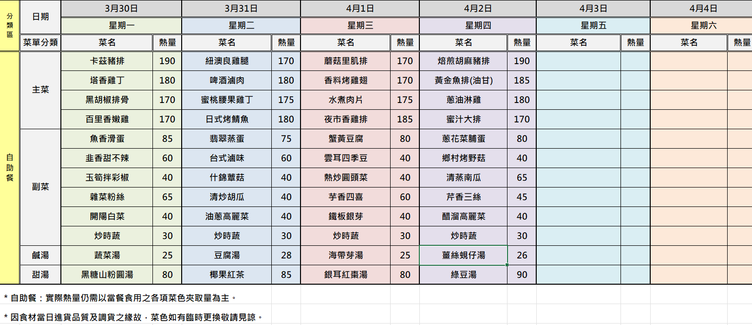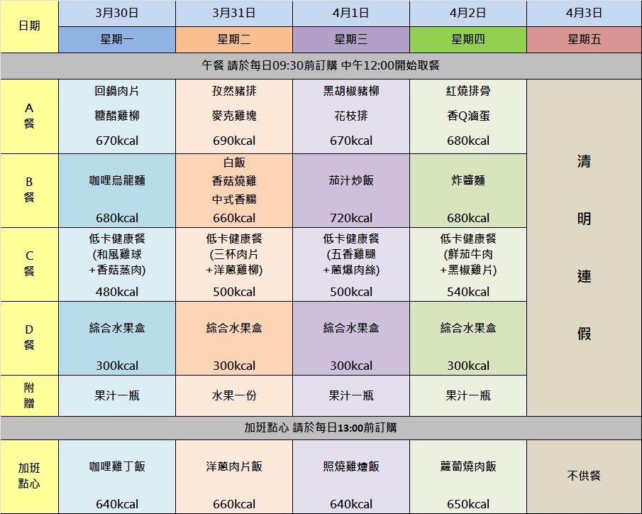 素食便當:3月30日點此 3月31日點此 4月1日點此 4月2日點此