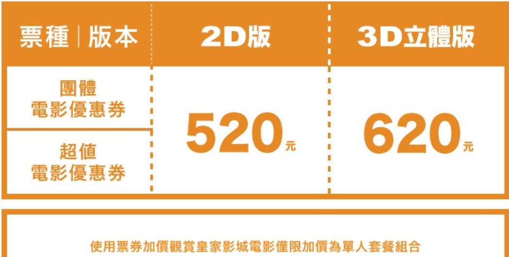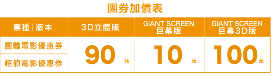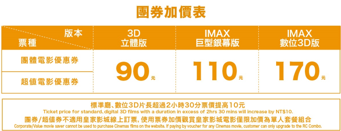 5.可加價觀賞IMAX 2D版、IMAX 3D版、數位3D立體版、數位3D立體版、巨幕廳、皇家影城 加價表如下: