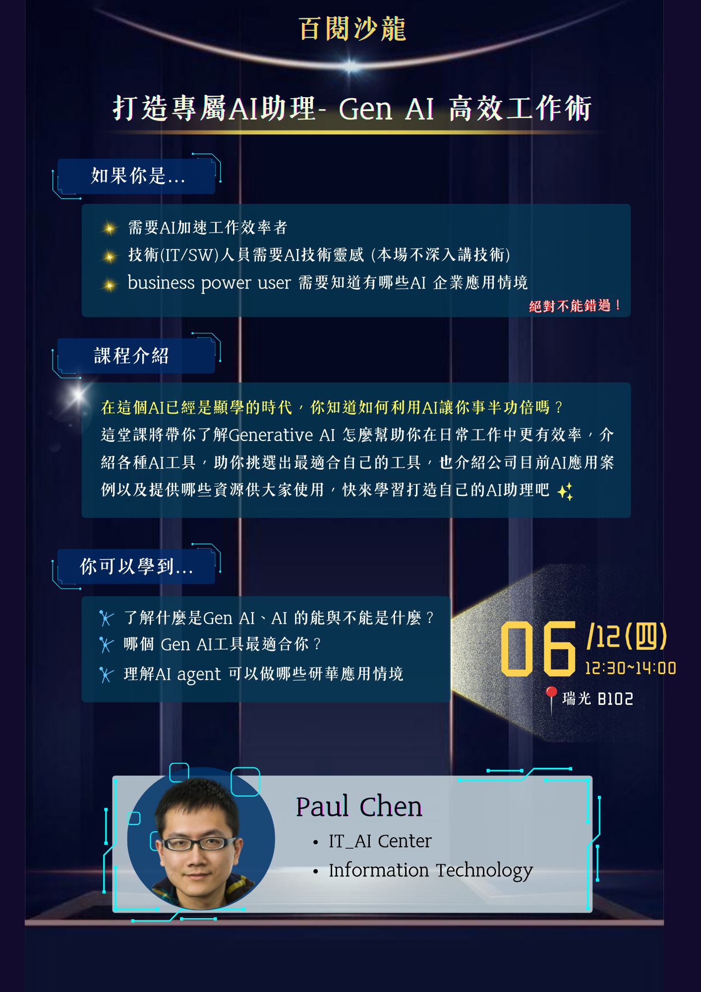 這次榮幸邀請到Paul Chen 來為大家分享如何應用 Gen AI 為自己的工作加值!