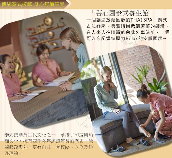 2.內容包含:沐浴更衣→泰式古法舒壓→全身精油推拿→頭肩頸穴位舒壓含熱敷→被動式瑜珈(以上內容限一次使用完畢)。